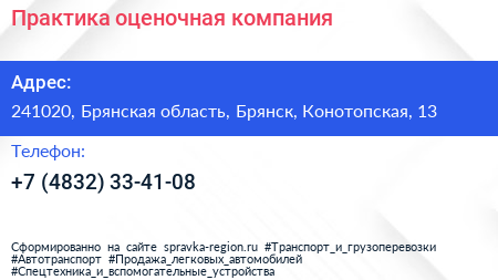 Практика, оценочная компания по адресу 241020, Брянская область, Брянск, Конотопская, 13 в дальнейшем Организация, размещена в следующих категориях: