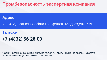 Промбезопасность, экспертная компания по адресу 241013, Брянская область, Брянск, Медведева, 59а в дальнейшем Организация, размещена в следующих категориях: