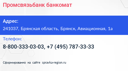 Промсвязьбанк, банкомат по адресу 241037, Брянская область, Брянск, Авиационная, 1а в дальнейшем Организация, размещена в следующих категориях: