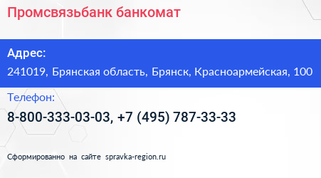 Промсвязьбанк, банкомат по адресу 241019, Брянская область, Брянск, Красноармейская, 100 в дальнейшем Организация, размещена в следующих категориях: