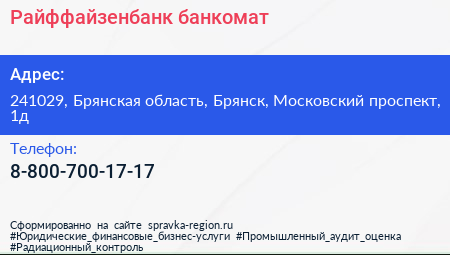 Райффайзенбанк, банкомат по адресу 241029, Брянская область, Брянск, Московский проспект, 1д в дальнейшем Организация, размещена в следующих категориях: