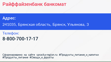 Райффайзенбанк, банкомат по адресу 241035, Брянская область, Брянск, Ульянова, 3 в дальнейшем Организация, размещена в следующих категориях: