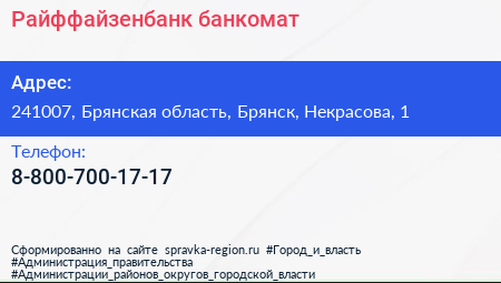 Райффайзенбанк, банкомат по адресу 241007, Брянская область, Брянск, Некрасова, 1 в дальнейшем Организация, размещена в следующих категориях: