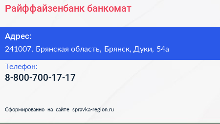 Райффайзенбанк, банкомат по адресу 241007, Брянская область, Брянск, Дуки, 54а в дальнейшем Организация, размещена в следующих категориях: