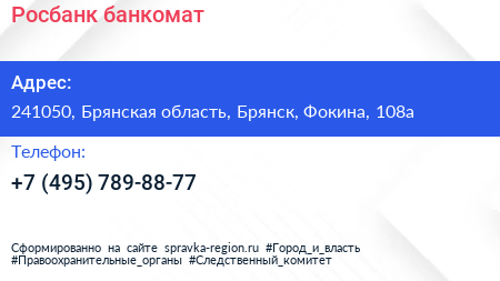 Росбанк, банкомат по адресу 241050, Брянская область, Брянск, Фокина, 108а в дальнейшем Организация, размещена в следующих категориях: