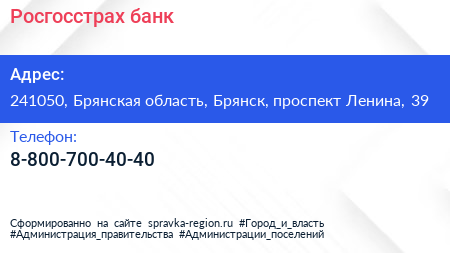 Росгосстрах банк по адресу 241050, Брянская область, Брянск, проспект Ленина, 39 в дальнейшем Организация, размещена в следующих категориях: