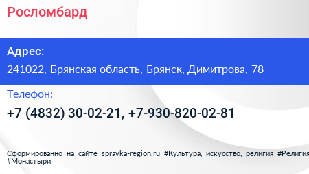 Росломбард по адресу 241022, Брянская область, Брянск, Димитрова, 78 в дальнейшем Организация, размещена в следующих категориях: