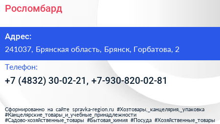 Росломбард по адресу 241037, Брянская область, Брянск, Горбатова, 2 в дальнейшем Организация, размещена в следующих категориях: