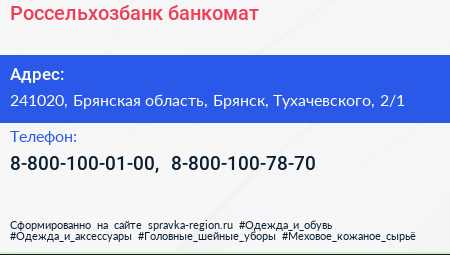 Россельхозбанк, банкомат по адресу 241020, Брянская область, Брянск, Тухачевского, 2/1 в дальнейшем Организация, размещена в следующих категориях: