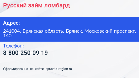 Русский займ, ломбард по адресу 241004, Брянская область, Брянск, Московский проспект, 140 в дальнейшем Организация, размещена в следующих категориях: