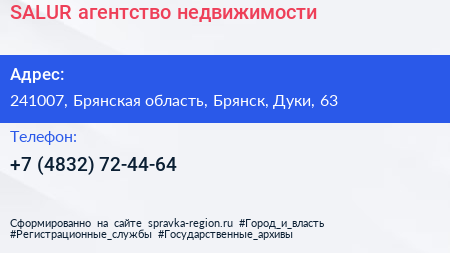 SALUR, агентство недвижимости по адресу 241007, Брянская область, Брянск, Дуки, 63 в дальнейшем Организация, размещена в следующих категориях: