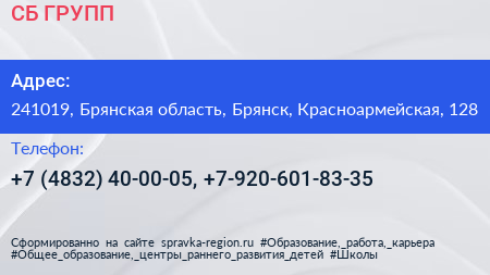 СБ-ГРУПП по адресу 241019, Брянская область, Брянск, Красноармейская, 128 в дальнейшем Организация, размещена в следующих категориях:
