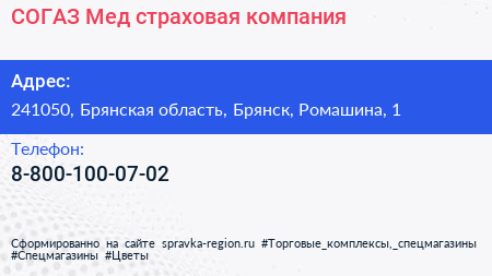 СОГАЗ-Мед, страховая компания по адресу 241050, Брянская область, Брянск, Ромашина, 1 в дальнейшем Организация, размещена в следующих категориях:
