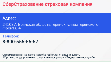 СберСтрахование, страховая компания по адресу 241037, Брянская область, Брянск, улица Брянского Фронта, 4 в дальнейшем Организация, размещена в следующих категориях: