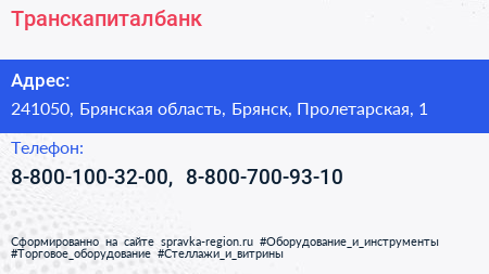 Транскапиталбанк по адресу 241050, Брянская область, Брянск, Пролетарская, 1 в дальнейшем Организация, размещена в следующих категориях: