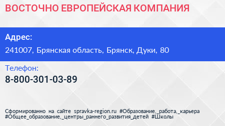 ВОСТОЧНО ЕВРОПЕЙСКАЯ КОМПАНИЯ по адресу 241007, Брянская область, Брянск, Дуки, 80 в дальнейшем Организация, размещена в следующих категориях: