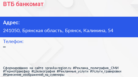 ВТБ, банкомат по адресу 241050, Брянская область, Брянск, Калинина, 54 в дальнейшем Организация, размещена в следующих категориях: