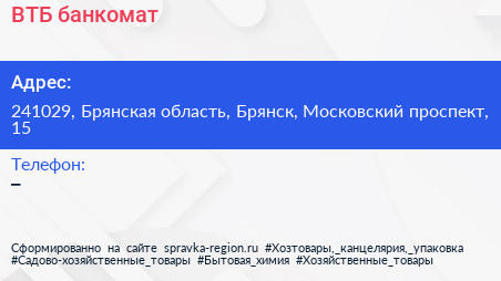 ВТБ, банкомат по адресу 241029, Брянская область, Брянск, Московский проспект, 15 в дальнейшем Организация, размещена в следующих категориях: