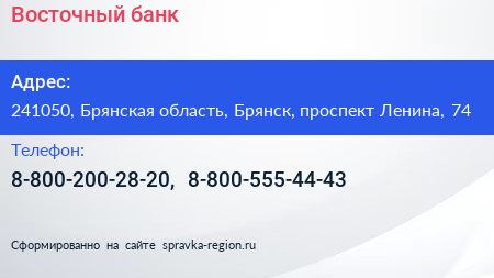 Восточный, банк по адресу 241050, Брянская область, Брянск, проспект Ленина, 74 в дальнейшем Организация, размещена в следующих категориях: