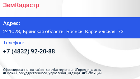 ЗемКадастр по адресу 241028, Брянская область, Брянск, Карачижская, 73 в дальнейшем Организация, размещена в следующих категориях: