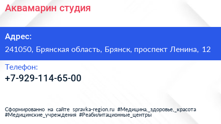 Аквамарин, студия по адресу 241050, Брянская область, Брянск, проспект Ленина, 12 в дальнейшем Организация, размещена в следующих категориях: