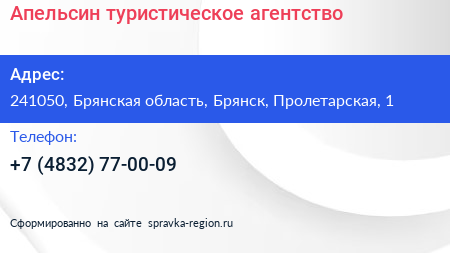 Апельсин, туристическое агентство по адресу 241050, Брянская область, Брянск, Пролетарская, 1 в дальнейшем Организация, размещена в следующих категориях: