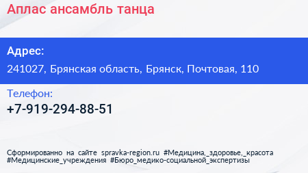 Аплас, ансамбль танца по адресу 241027, Брянская область, Брянск, Почтовая, 110 в дальнейшем Организация, размещена в следующих категориях: