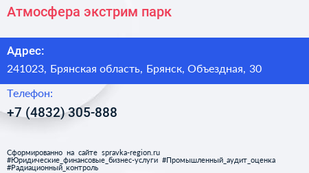 Атмосфера, экстрим-парк по адресу 241023, Брянская область, Брянск, Объездная, 30 в дальнейшем Организация, размещена в следующих категориях: