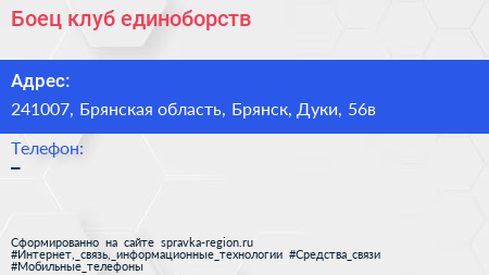 Боец, клуб единоборств по адресу 241007, Брянская область, Брянск, Дуки, 56в в дальнейшем Организация, размещена в следующих категориях: