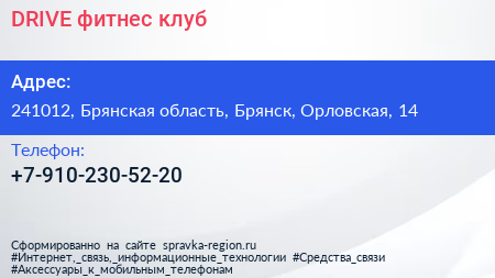 DRIVE, фитнес-клуб по адресу 241012, Брянская область, Брянск, Орловская, 14 в дальнейшем Организация, размещена в следующих категориях: