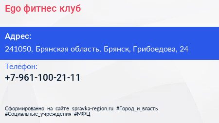 Ego, фитнес-клуб по адресу 241050, Брянская область, Брянск, Грибоедова, 24 в дальнейшем Организация, размещена в следующих категориях: