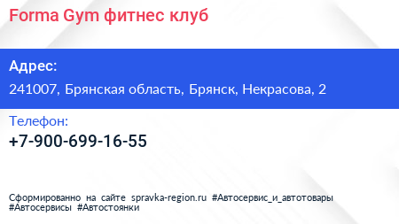 Forma Gym, фитнес-клуб по адресу 241007, Брянская область, Брянск, Некрасова, 2 в дальнейшем Организация, размещена в следующих категориях: