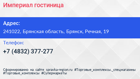 Империал, гостиница по адресу 241022, Брянская область, Брянск, Речная, 19 в дальнейшем Организация, размещена в следующих категориях: