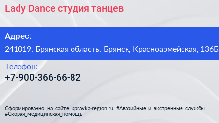 Lady Dance, студия танцев по адресу 241019, Брянская область, Брянск, Красноармейская, 136Б в дальнейшем Организация, размещена в следующих категориях: