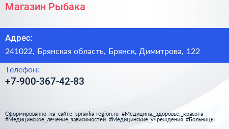 Магазин Рыбака по адресу 241022, Брянская область, Брянск, Димитрова, 122 в дальнейшем Организация, размещена в следующих категориях: