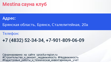 Mestina, сауна-клуб по адресу Брянская область, Брянск, Сталелитейная, 20а в дальнейшем Организация, размещена в следующих категориях: