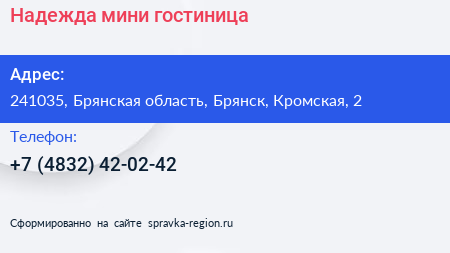 Надежда, мини-гостиница по адресу 241035, Брянская область, Брянск, Кромская, 2 в дальнейшем Организация, размещена в следующих категориях: