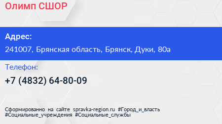 Олимп, СШОР по адресу 241007, Брянская область, Брянск, Дуки, 80а в дальнейшем Организация, размещена в следующих категориях: