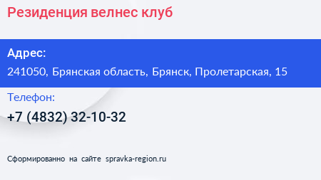 Резиденция, велнес-клуб по адресу 241050, Брянская область, Брянск, Пролетарская, 15 в дальнейшем Организация, размещена в следующих категориях: