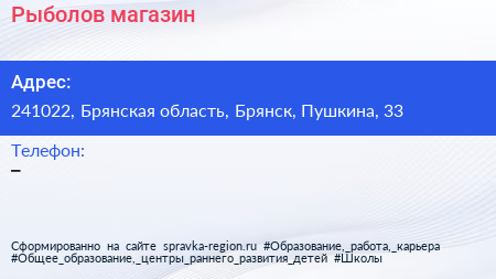 Рыболов, магазин по адресу 241022, Брянская область, Брянск, Пушкина, 33 в дальнейшем Организация, размещена в следующих категориях: