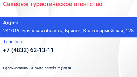 Саквояж, туристическое агентство по адресу 241019, Брянская область, Брянск, Красноармейская, 128 в дальнейшем Организация, размещена в следующих категориях: