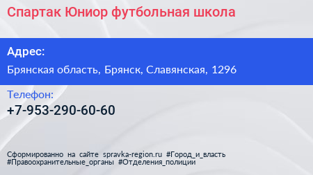 Спартак Юниор, футбольная школа по адресу Брянская область, Брянск, Славянская, 1296 в дальнейшем Организация, размещена в следующих категориях: