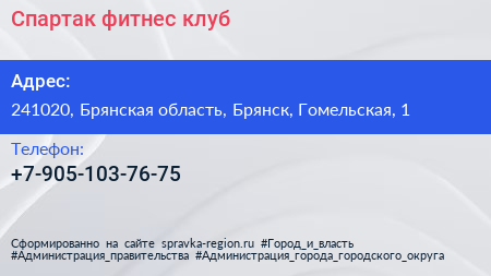 Спартак, фитнес клуб по адресу 241020, Брянская область, Брянск, Гомельская, 1 в дальнейшем Организация, размещена в следующих категориях: