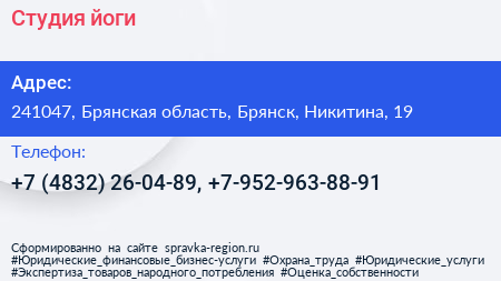 Студия йоги по адресу 241047, Брянская область, Брянск, Никитина, 19 в дальнейшем Организация, размещена в следующих категориях: