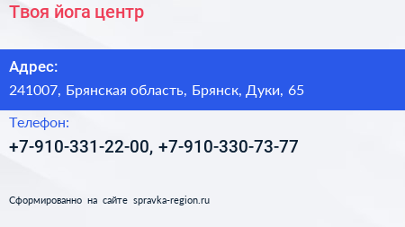Твоя йога, центр по адресу 241007, Брянская область, Брянск, Дуки, 65 в дальнейшем Организация, размещена в следующих категориях: