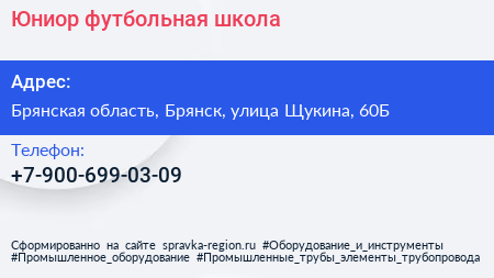 Юниор, футбольная школа по адресу Брянская область, Брянск, улица Щукина, 60Б в дальнейшем Организация, размещена в следующих категориях: