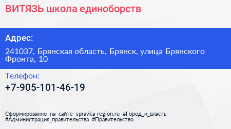 ВИТЯЗЬ, школа единоборств по адресу 241037, Брянская область, Брянск, улица Брянского Фронта, 10 в дальнейшем Организация, размещена в следующих категориях: