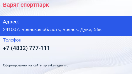 Варяг, спортпарк по адресу 241007, Брянская область, Брянск, Дуки, 56в в дальнейшем Организация, размещена в следующих категориях: