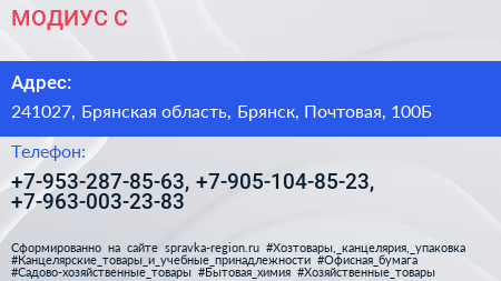 МОДИУС-С по адресу 241027, Брянская область, Брянск, Почтовая, 100Б в дальнейшем Организация, размещена в следующих категориях: