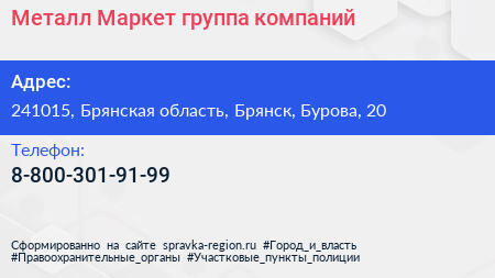 Металл-Маркет, группа компаний по адресу 241015, Брянская область, Брянск, Бурова, 20 в дальнейшем Организация, размещена в следующих категориях: